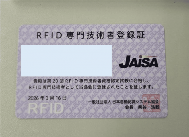 先日、第20回RFID専門技術者資格認定試験に合格し、